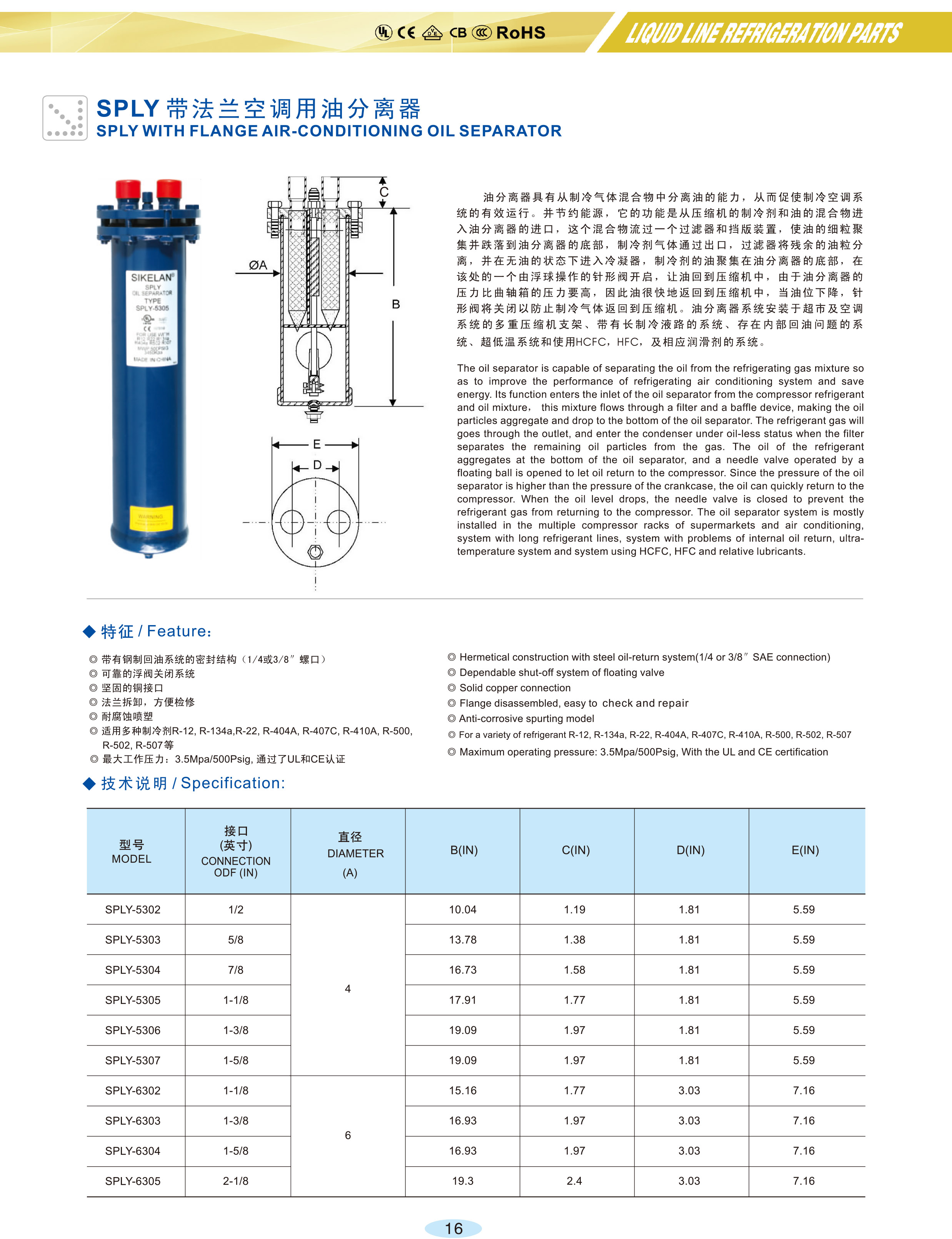 產品簡介:油分離器具有從制冷氣體混合物中分離油的能力,從而促使制冷空調系統的有效運行。并節約能源,它的功能是從壓縮機的制冷劑和油的混合物進入油分離器的進口,這個混合物流過一個過濾器和擋版裝置,使油的細粒聚集并跌落到油分離器的底部,制冷劑氣體通過出口,過濾器將殘余的油粒分離,并在無油的狀態下進入冷凝器,制冷劑的油聚集在油分離器的底部,在該處的一個由浮球操作的針形閥開啟,讓油回到壓縮機中,由于油分離器的壓力比曲軸箱的壓力要高,因此油很快地返回到壓縮機中,當油位下降,針形閥將關閉以防止制冷氣體返回到壓縮機。油分離器系統安裝于超市及空調系統的多重壓縮機支架、帶有長制冷液路的系統、存在內部回油問題的系統、超低溫系統和使用HCFC,HFC,及相應潤滑劑的系統。