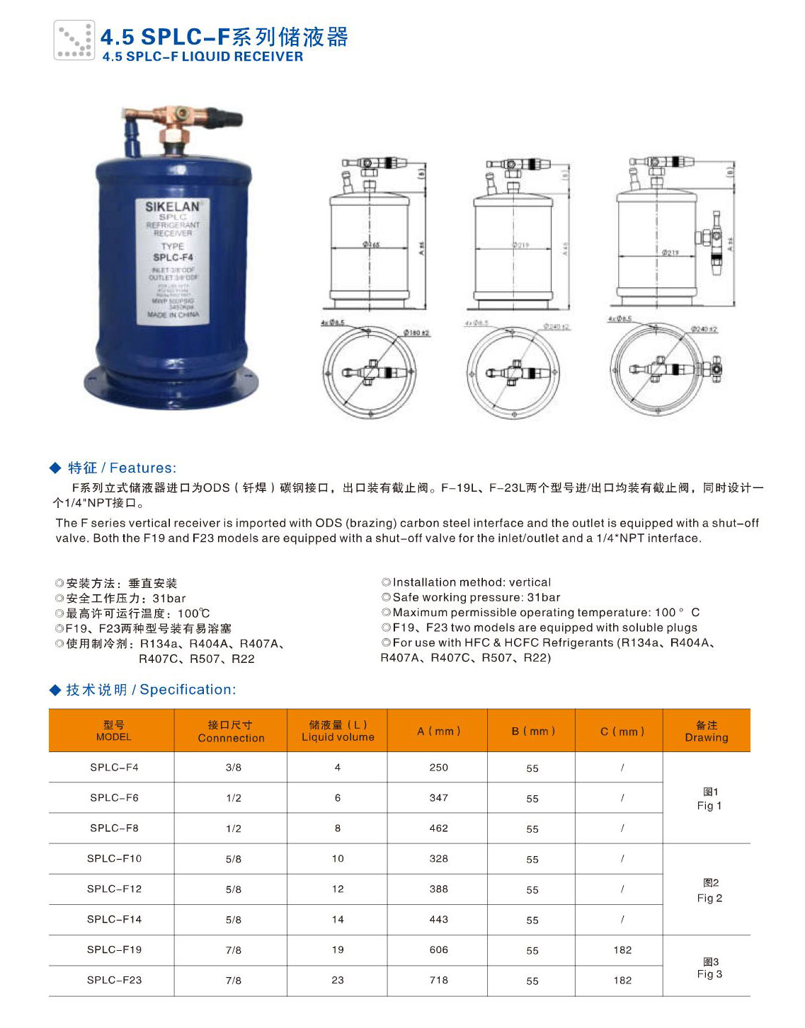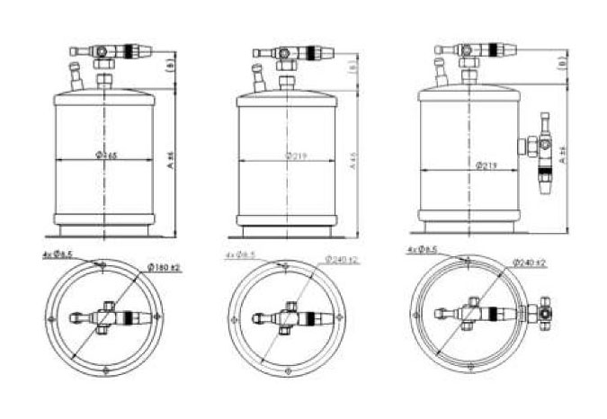 產品簡介:F系列立式儲液器進口為ODS(釬焊)碳鋼接口,出口裝有截止閥。F-19L、F-23L兩個型號進出口均裝有截止閥,同時設計一個1/4"NPT接口。