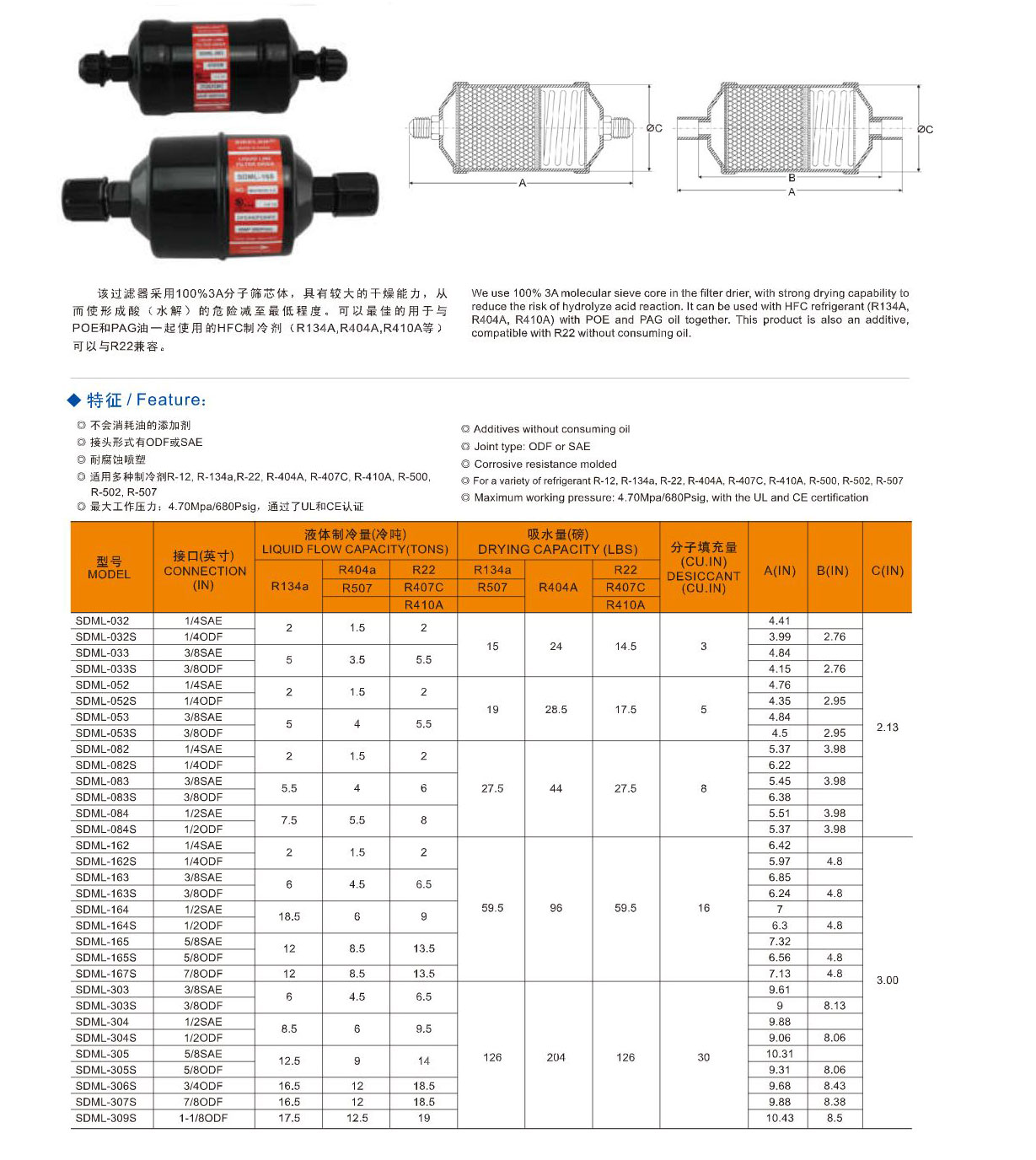 產品簡介:該過濾器采用100%3A分子篩芯體,具有較大的干燥能力,從而使形成酸(水解)的危險減至最低程度。可以最佳地用于與POE和PAG油一起使用的HFC制冷劑(R134A,R404A,R410A等)可以與R22兼容。