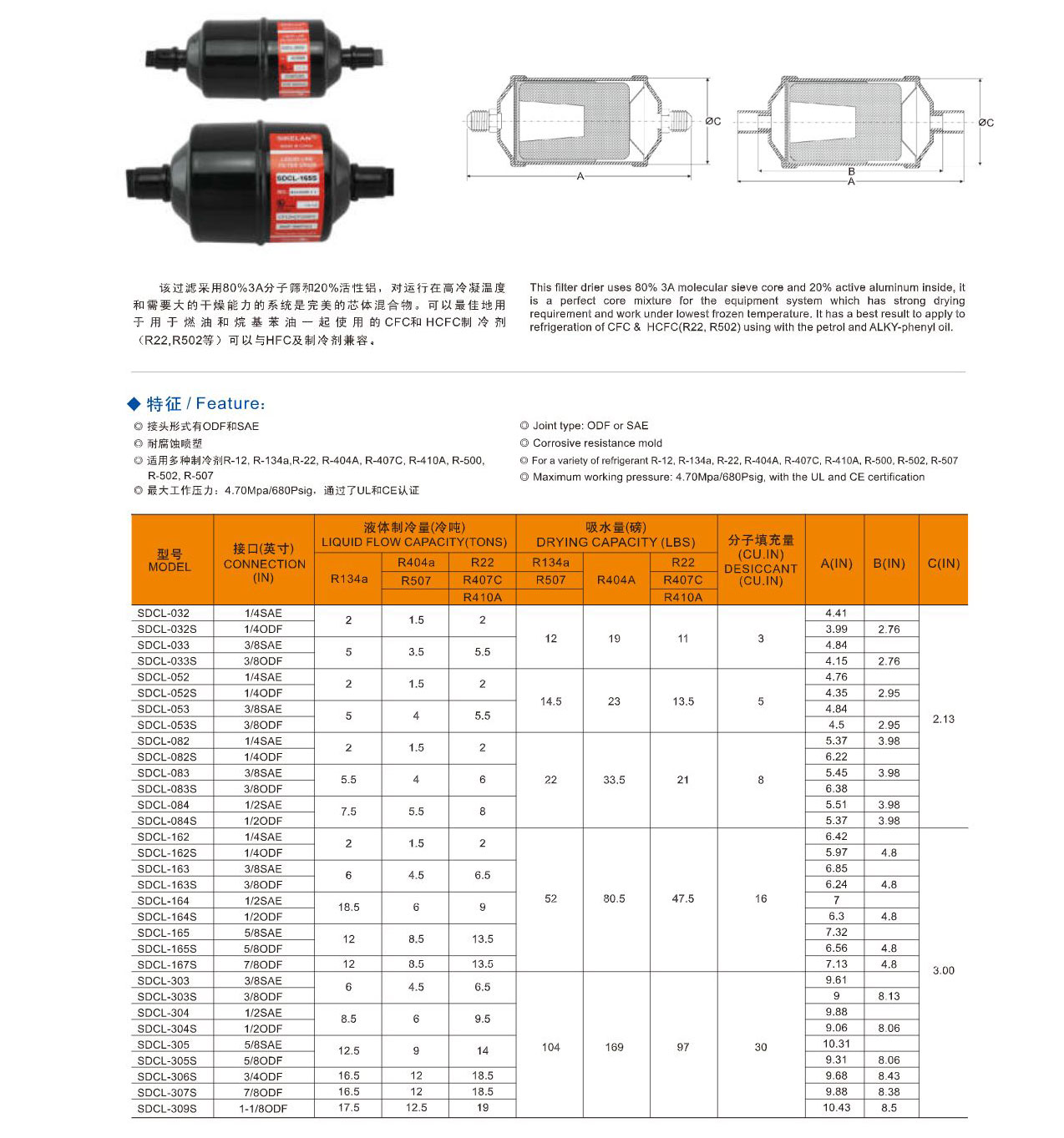 產品簡介:該過濾器采用80%3A分子篩和20%活性鋁,對運行在高冷凝溫度和需要大的干燥能力的系統是最完美的芯體混合物。可以最佳地用于燃油和烷基苯油一起使用的CFC和HCFC制冷劑(R22,R502等)可以與HFC及制冷劑兼容。